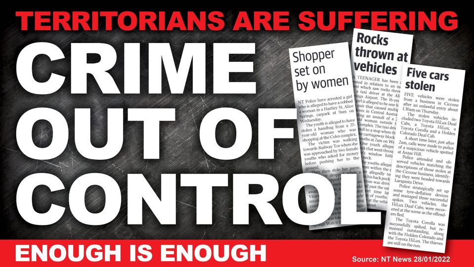 In the NT News today there were 3 articles on crime in Alice Springs. The Gunner Government has failed to deal with the escalating crime rate and Territorians are left to pay the price.