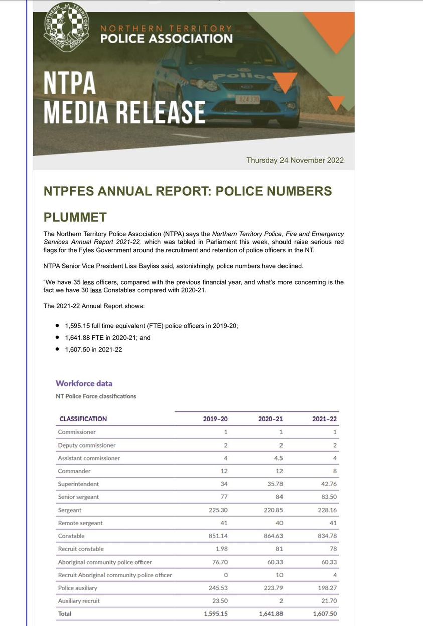 We have 35 less Police than a year ago in the Northern Territory. Labor continue to say that they have invested more money in Police than ever before, maybe they should be investing in the health and wellbeing of our Police plus supporting them with stronger laws.